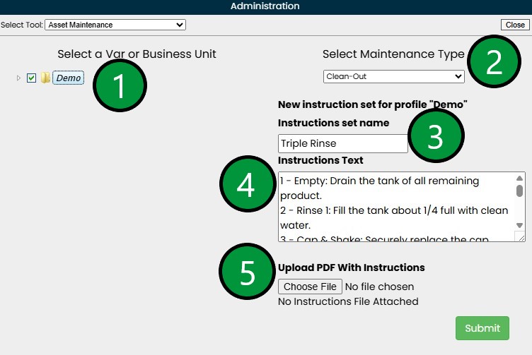 Asset Maintenance is a tool that allows users to create tasks, or sets of instructions, for maintaining machinery. With this tool available to administrative users with the 8.7 release, Clean-Out tasks can be created that outline proper machine rinse procedures following the application of any product, tank mix, etc. Clean-Out task utilization is largely driven by the regulatory needs surrounding the application of certain products, but can later be used in Operations for any application purposes.