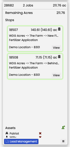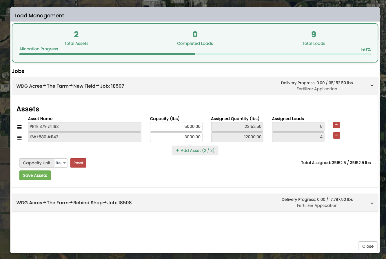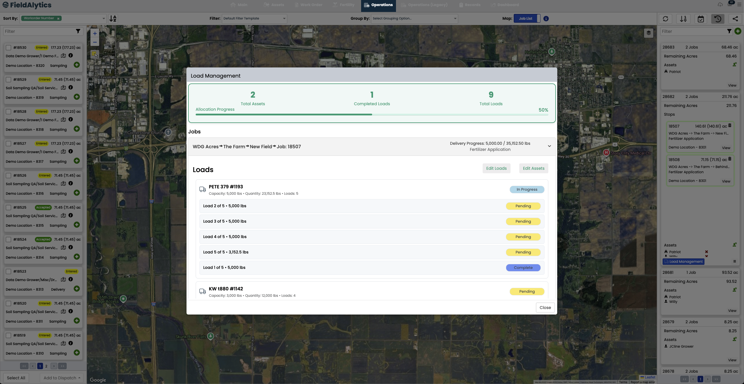 Within the New Operations module, Load Management can be utilized to aid dispatchers in the process of getting product out the door to facilitate application and delivery of those products. This utility allows users to select trucks, trailers, machines, and other equipment assets to populate or assign capacities, and organize the loads however they see fit. With the 8.7 release, this tool allows users to manage loads by job within a dispatch list, future advancements within this utility intend to streamline this process across entire dispatch lists.