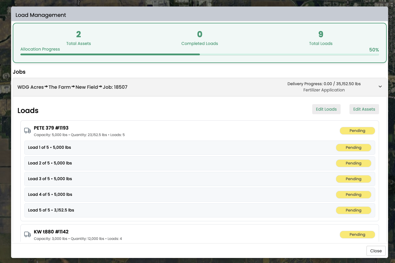 - The loads are set and have started, users can go into the Load Management modal at any time and change the status of each load by toggling the status on the right side