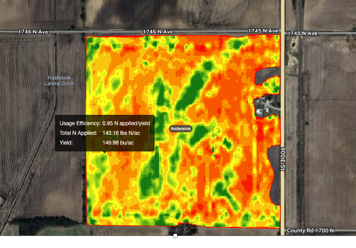 Lower values indicate more efficient nitrogen use (less N applied per bushel produced), while higher values highlight areas where nitrogen use was less efficient.