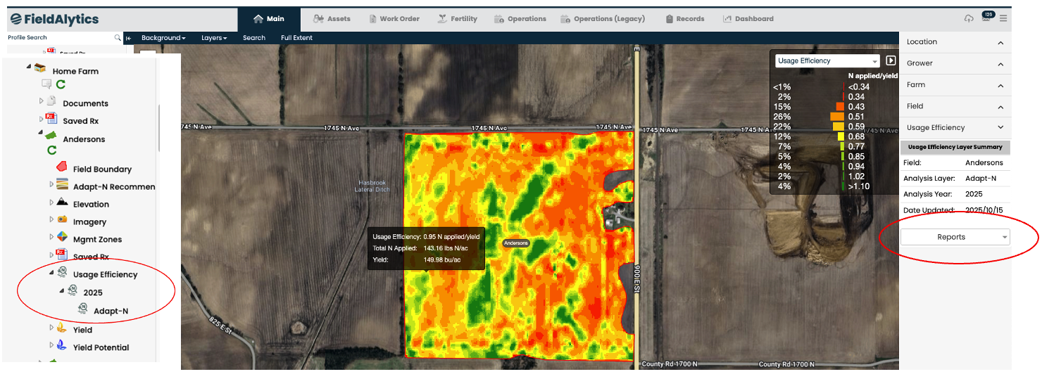 We’re introducing a powerful new way to visualize nitrogen performance across your fields. The Usage Efficiency Tool when selected to run generates a new map layer within the Main tree under each Adapt-N field. This layer calculates how efficiently nitrogen was used by comparing total nitrogen applied to yield results for each raster cell.
