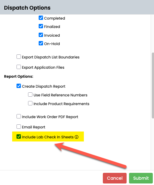 Under the Report Options section, select the checkbox to "Include Lab Check In Sheets". This selection will allow the system to create a Lab Check In form per job found within the Dispatch Order.