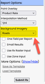 New map display options will now be available to users when viewing and printing their Fertilizer Rx reports, both within the setup configuration found throughout the Fertility Module and within the Rx setup process found in the Master Soil Book creation. Users will have display options within their PDF report for the traditional background imagery plus roads, roads-only and no background layers at all. This will help for visual needs for some clients and with printing assistance is certain scenarios.