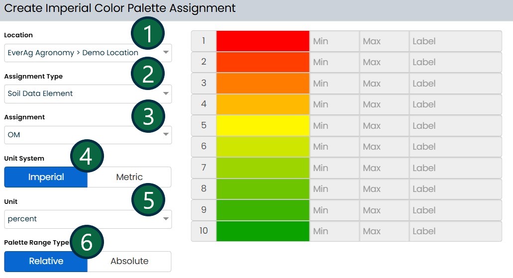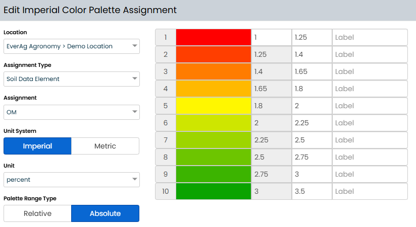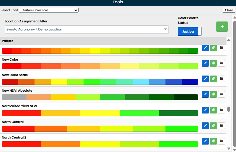 Once a palette has been created, it can be assigned to any available dataset that supports custom color palettes: As-Applied Commodity, As-Planted Commodity, Fertilizer Products, Imagery, Soil Data Elemental, Yield Data Commodity, Yield Normalization, Yield Profit, Veris EC Data, Management Zones, and Field Sample.