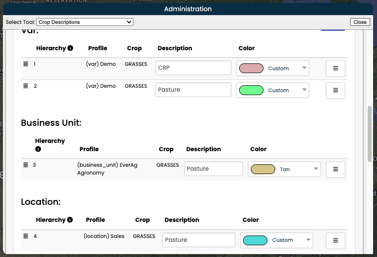 Profile - If your organization wants to display different crop description colors for specific Business Units or Locations, you can now create additional descriptions for each crop and assign them to the appropriate profile. When a Business Unit or Location profile is linked to a description, that description will only be visible within those profiles. In the example below a specific Business Unit wanted to use a different color for Pasture Grasses while a location within that Business Unit wanted another different color. In this case only the Sales location will have the additional description only assigned to that location.
