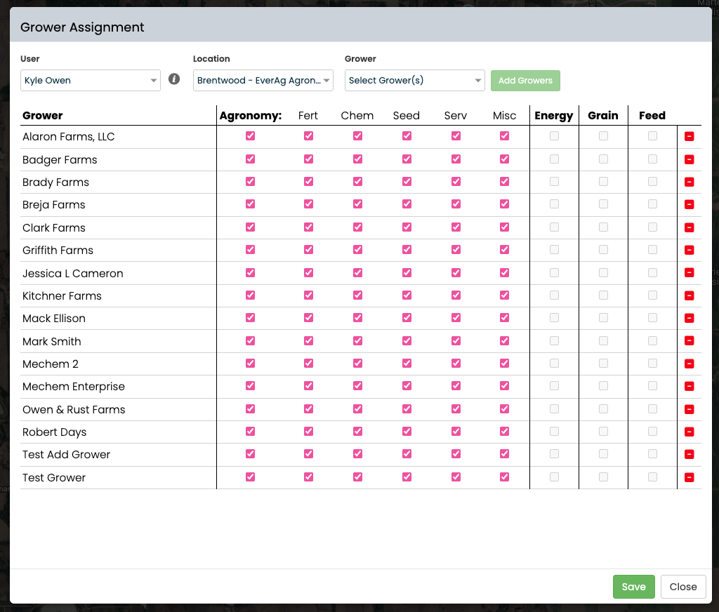 The Assigned Grower will now appear within the list below. click the red - to remove the Grower. The boxes next to each Grower indicates what categories of functionality are available for the Grower, currently Agronomy is the only selectable category. Energy, Grain, and Feed will become available in future updates.