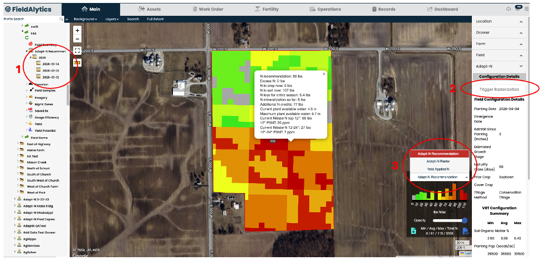 Creating and saving a fertility recommendation in the Fertility tab will store the Adapt-N recommendation in your field tree. Alternatively, you can save the daily recommendation by triggering rasterization of the current Adapt-N layer. Once a raster has been created on a field, the raster will overwrite for that day each time a new recommendation is requested. The latest rendition of the raster will be saved for that day in the tree. There will then be a record in the field tree for that day and a new record will be create the next day (when in-season).